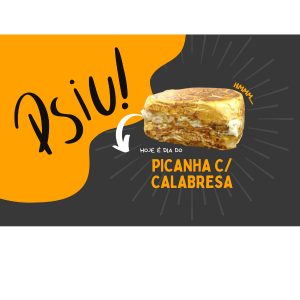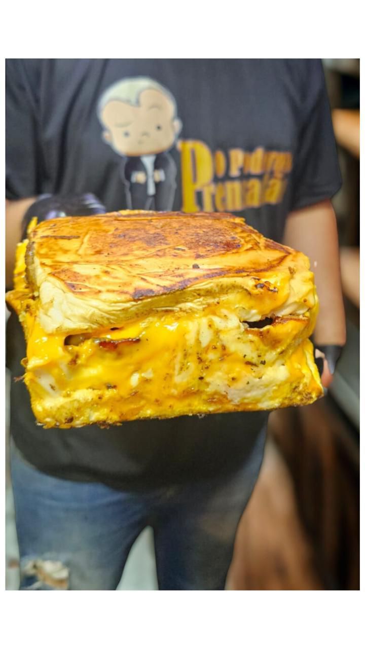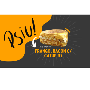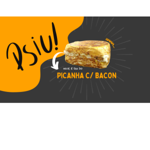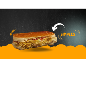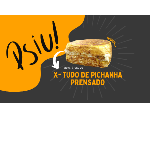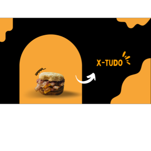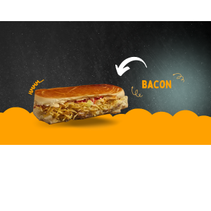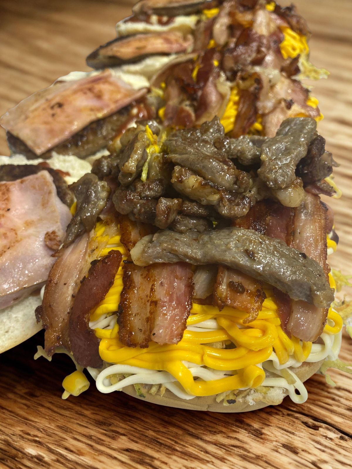 Pão, Hambúrguer de Picanha, queijo prato, presunto, contra filé em tiras, cheddar, catupiry, bacon, ketchup, mostarda, maionese, tomate, cebola, milho, ervilha, picles e batata palha.