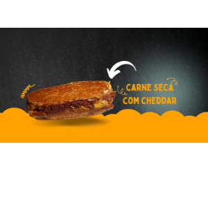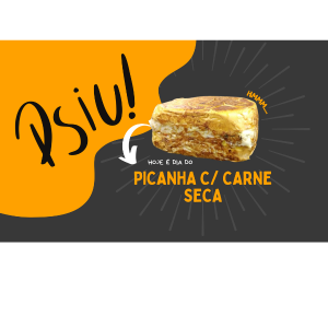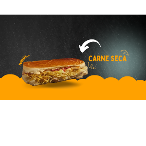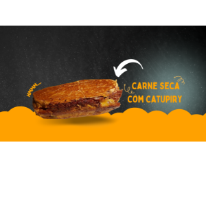 Pão, carne de picanha de 120g, queijo, presunto, carne seca, cheddar, ketchup, mostarda, maionese, tomate, cebola, milho, ervilha, picles e batata palha.