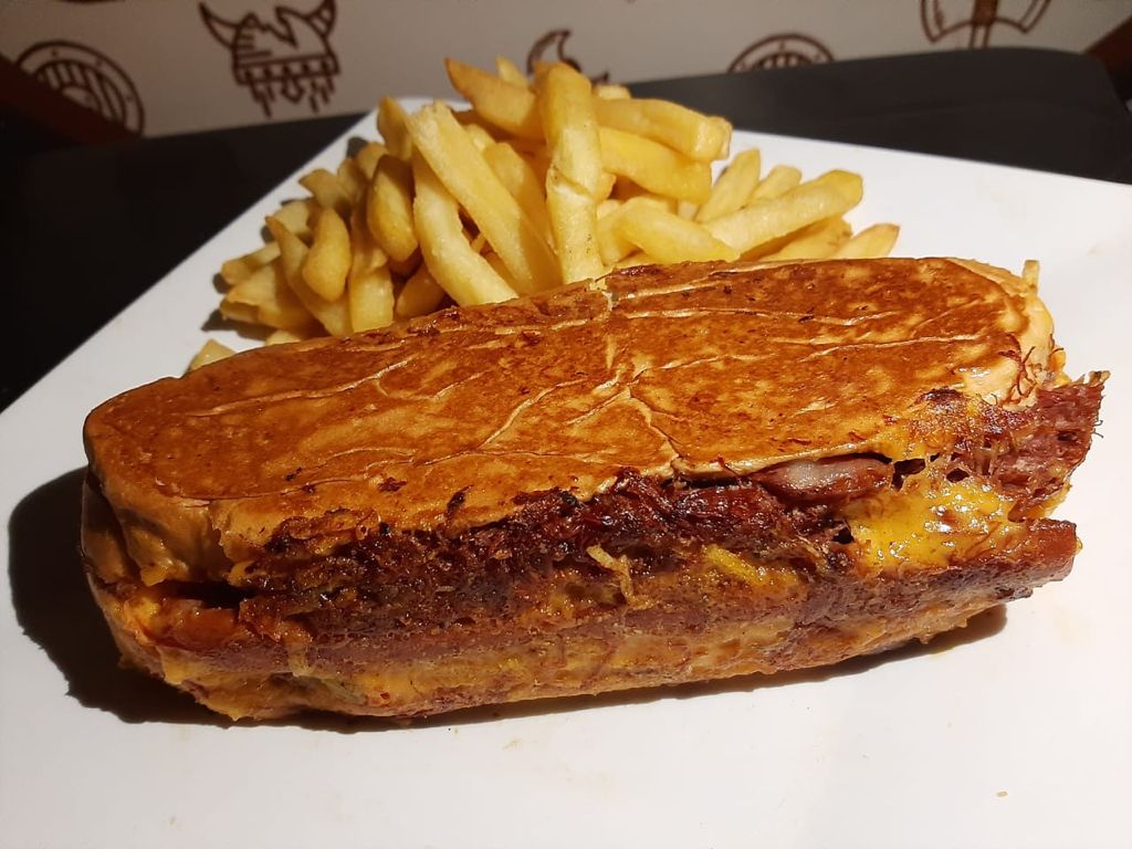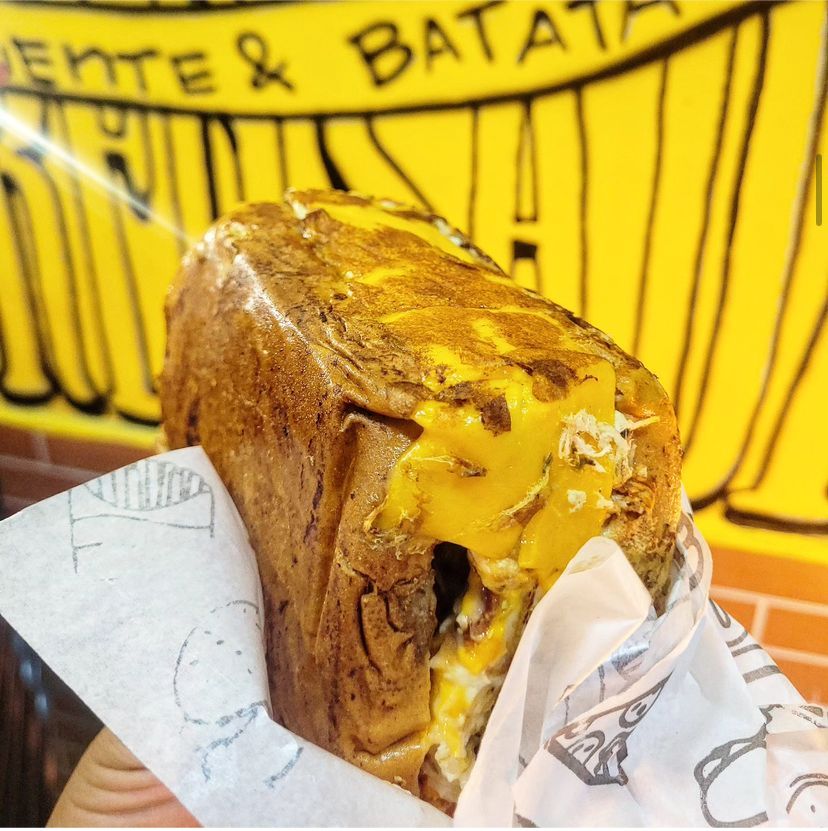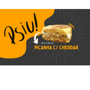 Pão, Hambúrguer de Picanha, queijo prato, presunto, costela desfiada, cheddar, ketchup, mostarda, maionese, tomate, cebola, milho, ervilha, picles e batata palha.