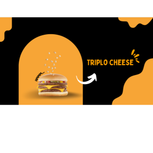 Pão, 3 hambúrgueres, 3 queijo cheddar, tomate, picles e molho especial.