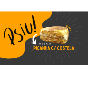 Pão, Hambúrguer de Picanha, queijo prato, presunto, costela desfiada, ketchup, mostarda, maionese, tomate, cebola, milho, ervilha, picles e batata palha.