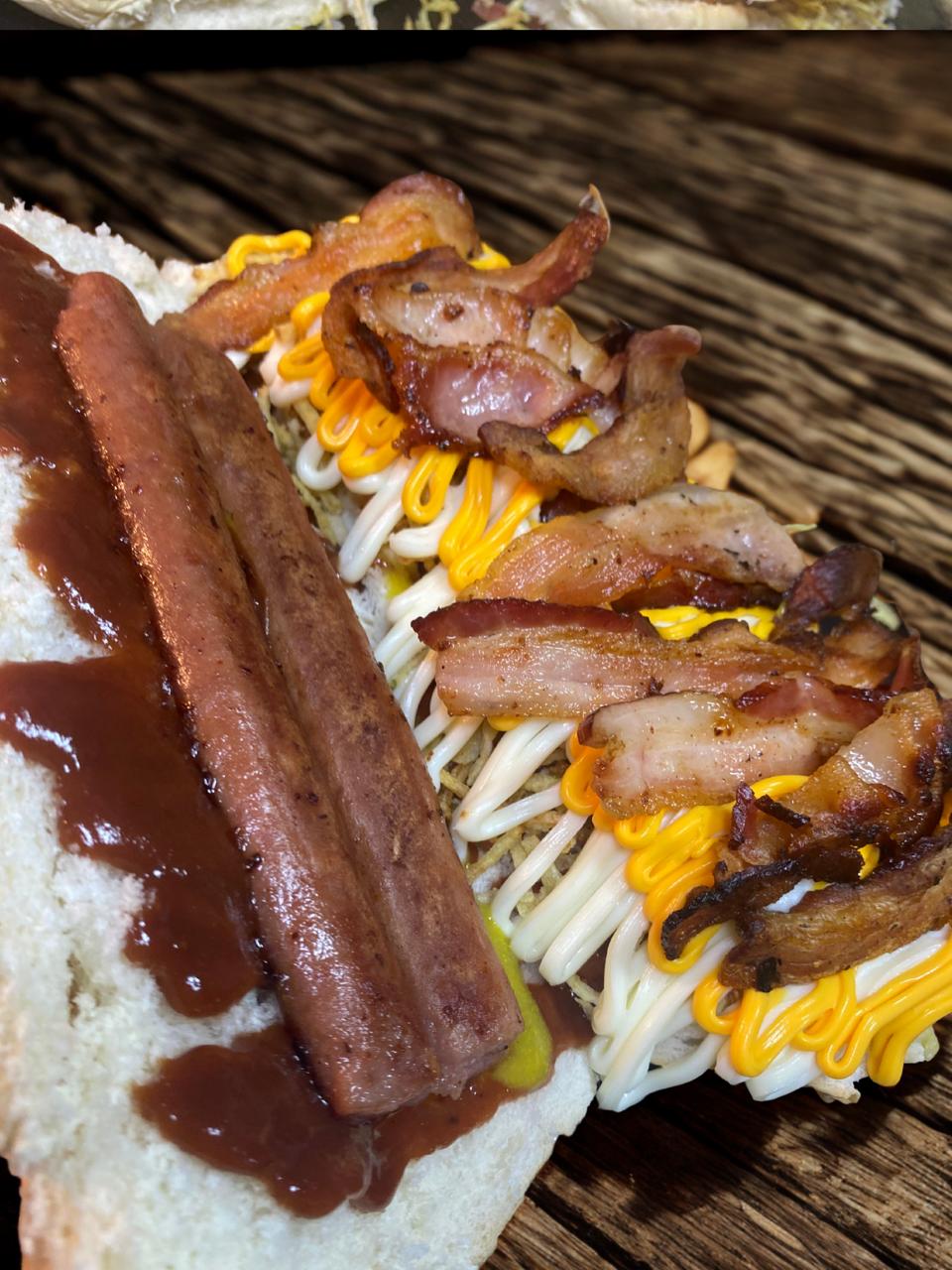 Pão, salsicha ou linguiça, Bacon, Cheddar, ketchup, mostarda, maionese, tomate, cebola, milho, ervilha e batata palha